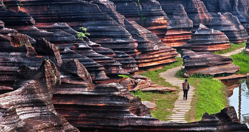 This spot is a very less traveled one hidden in western part of Hunan province. with 1.5hours tour, we may see the geat work of nature.The interesting thing is stone color changes in different weather:red in Sunny days, black in rainy days, brown and red on cloudy days. It even shows color difference during a day.